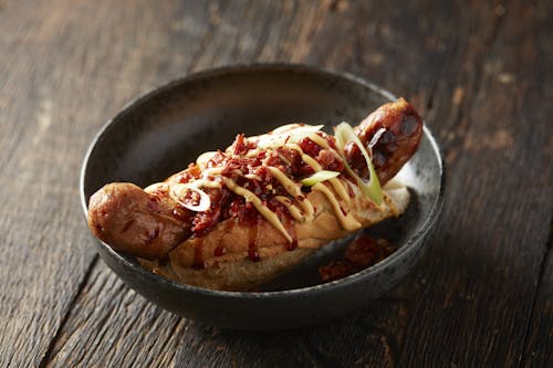 Eindigen doen we met de afwerking. Neem hiervoor een stuk stokbrood of hotdog broodje. Snijd deze open en vul het broodje met de gebakken uien, daarop leg je de The Duke of Berkshire® worst. Werk af met de krokant gebakken stukjes spek, bbq-saus en eventueel wat cheddarsaus. Om het helemaal af te maken kan hier wat gesneden pijpajuin overgedaan worden. Smakelijk!
