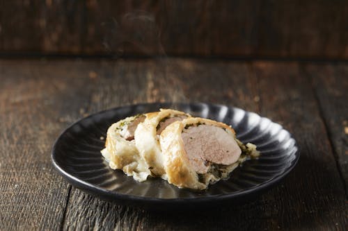 è La viande peut également être saisie avant d'être enveloppée dans la pâte. - Placez la pâte sur une plaque de cuisson avec le papier sulfurisé et mettez-la dans un four préchauffé à 170°C. Laissez cuire pendant au moins 20 minutes. Le filet mignon doit être joliment rosée, avec une température interne entre 57°C et 62°C pour une cuisson parfaite. Retirez du four et coupez délicatement pour préserver la texture croustillante de la pâte feuilletée. Présentez le filet mignon de porc de manière étagée sur une assiette. Bon appétit !